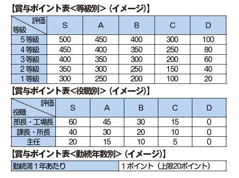 (※2)賞与ポイントは、賞与ポイント表<等級別><役職別><勤続年数別>のポイント合計数です(下図参照)。(例:3等級、主任、勤続年数満12年、人事評価Aの場合・・・①350P+ ②15P+③12P=377Pとなります。)なお、<等級別>のみの採用でもいいと思います。
